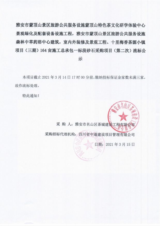 雅安市蒙頂山景區(qū)旅游公共服務設施蒙頂山特色茶文化研學體驗中心景觀綠化及配套設備設施工程,雅安市蒙頂山景區(qū)旅游公共服務設施森林中草藥浴中心建筑,室內(nèi)外裝修及景觀工程、十里梅香茶源小鎮(zhèn)項目(三期)164畝施工總承包一標段砂石采購項目(第二次)流標公示