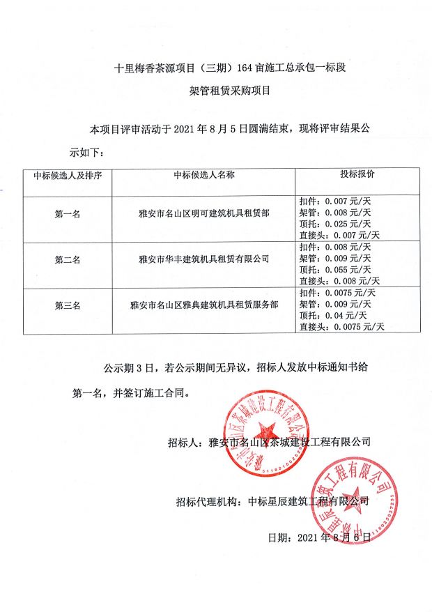 十里梅香茶源項(xiàng)目(三期)164畝施工總承包一標(biāo)段架管租賃采購中標(biāo)公示